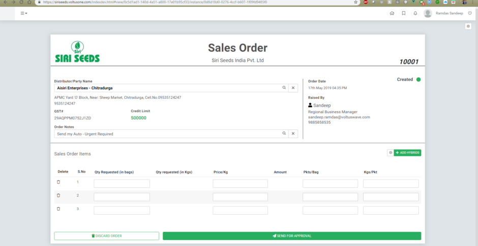 Background: Siri Seeds is a multi-million dollar seed manufacturing and distribution company with its sales operations spread across India, On average they receive 100,000 orders from 3,000+ dealers in a year and it has become cumbersome for the management to approve, track and dispatch received orders and manage inventory efficiently.